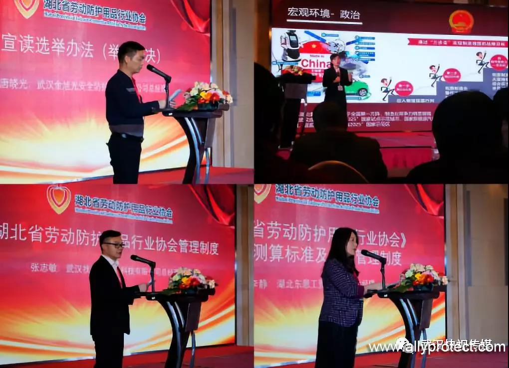 2019年3月9日,湖北省勞動防護用品行業(yè)協(xié)會正式成立,協(xié)會第一屆第一次會員大會在武漢光明萬麗大酒店召開。湖北省民政廳社會組織管理局副局長姜健,湖北省工商聯(lián)會員部部長江勇,國家勞動保護用品質(zhì)量監(jiān)督檢驗中心武漢站主任劉宏斌、教授程鈞,中國紡織品商業(yè)協(xié)會安全健康防護用品委員會秘書長高飛,浙江省安全健康防護用品行業(yè)協(xié)會秘書長王良基,中國鐵路武漢局集團有限公司物資供應段主任趙恒,卓爾集團商管處,湖北省企業(yè)國際合作協(xié)會等領導及嘉賓出席大會,并致以祝賀。